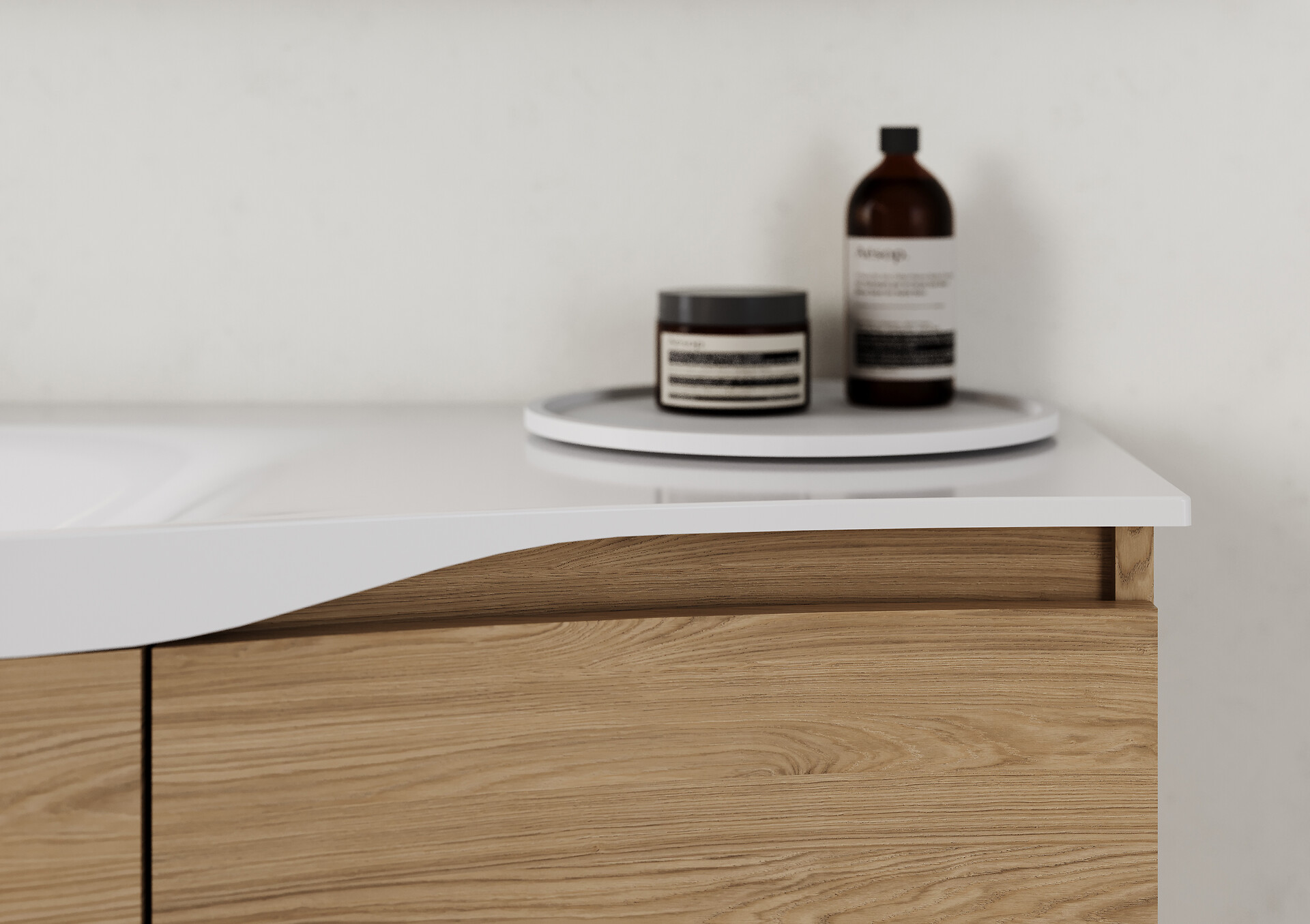 Wie ein Flügel schwebt der filigrane Mineralguss-Waschtisch über dem Korpus. Aus dem Rückschwung der sich auch nach oben verjüngenden Waschtischkante ergibt sich die seitliche Griffmulde. Optisch setzt sich damit der Schwungansatz der unteren Griffmulde fort, über die sich die beiden tiefen Auszüge öffnen lassen.